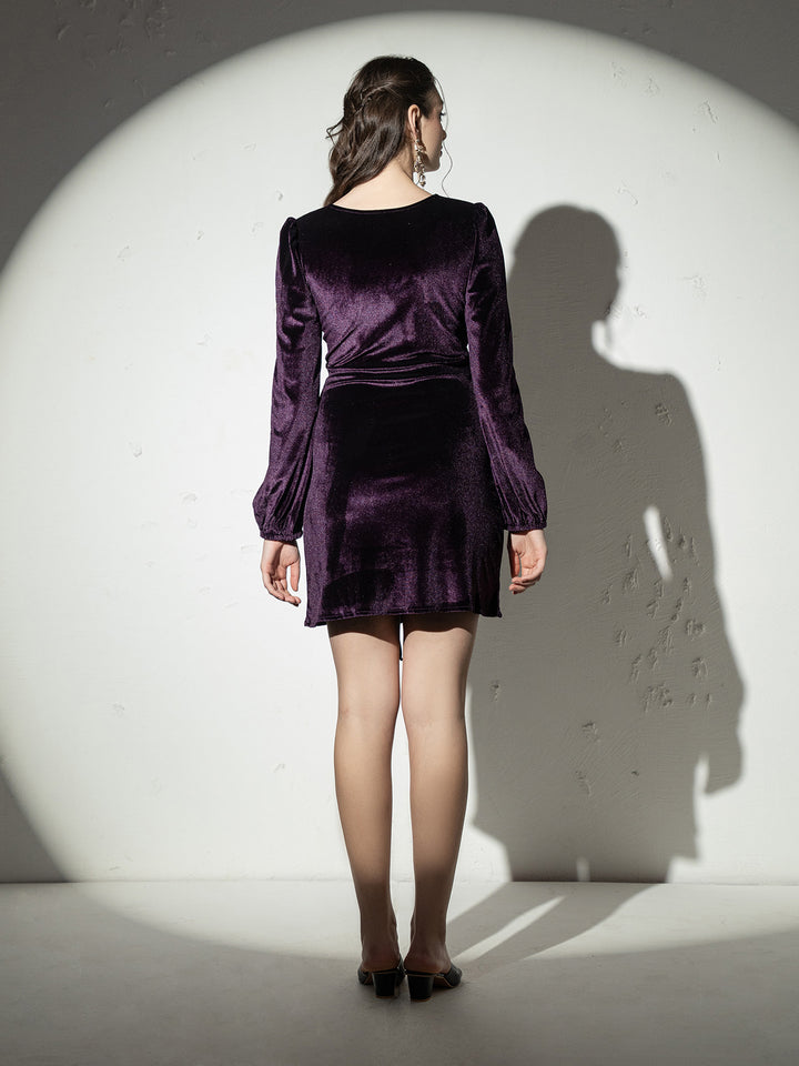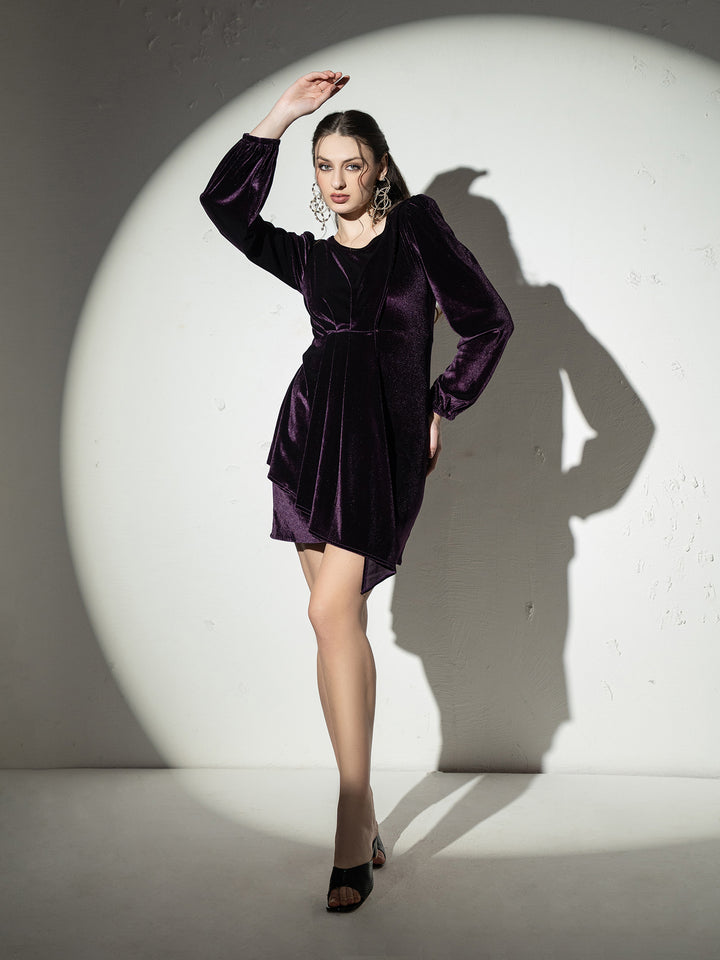 Asymmetric drape mini dress with balloon sleeve in Purple