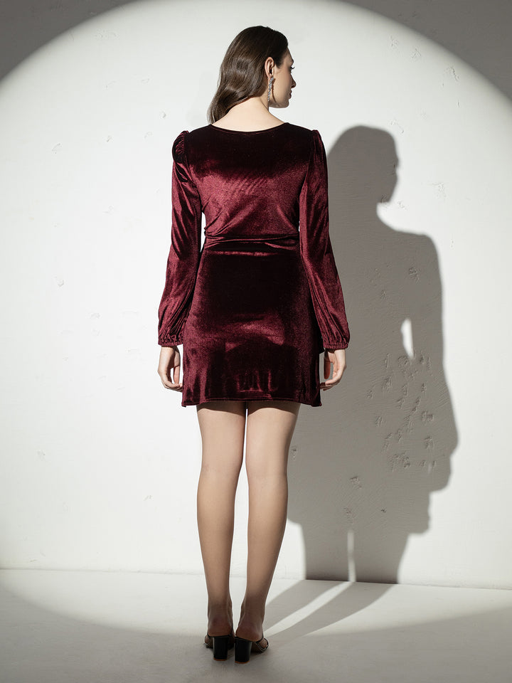 Asymmetric drape mini dress with balloon sleeve in Wine