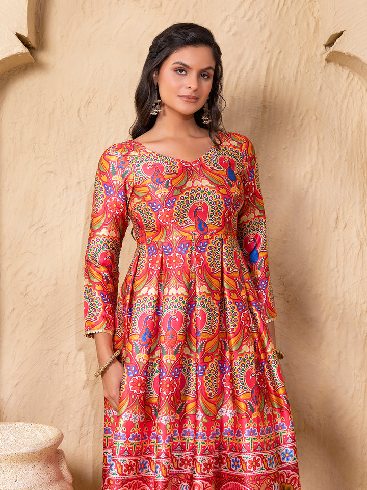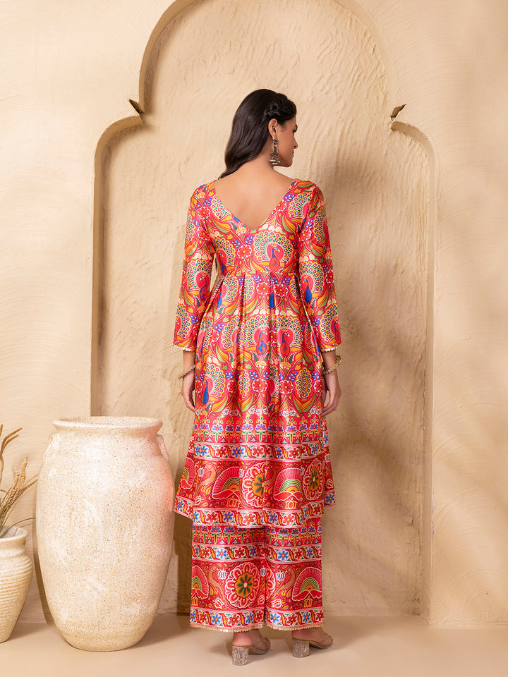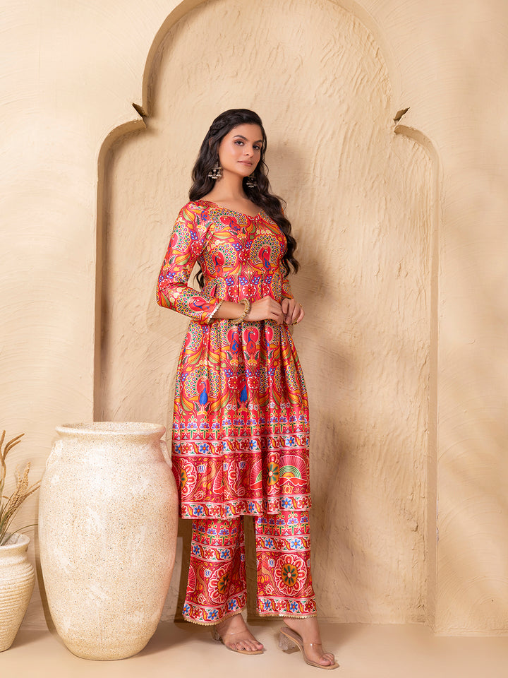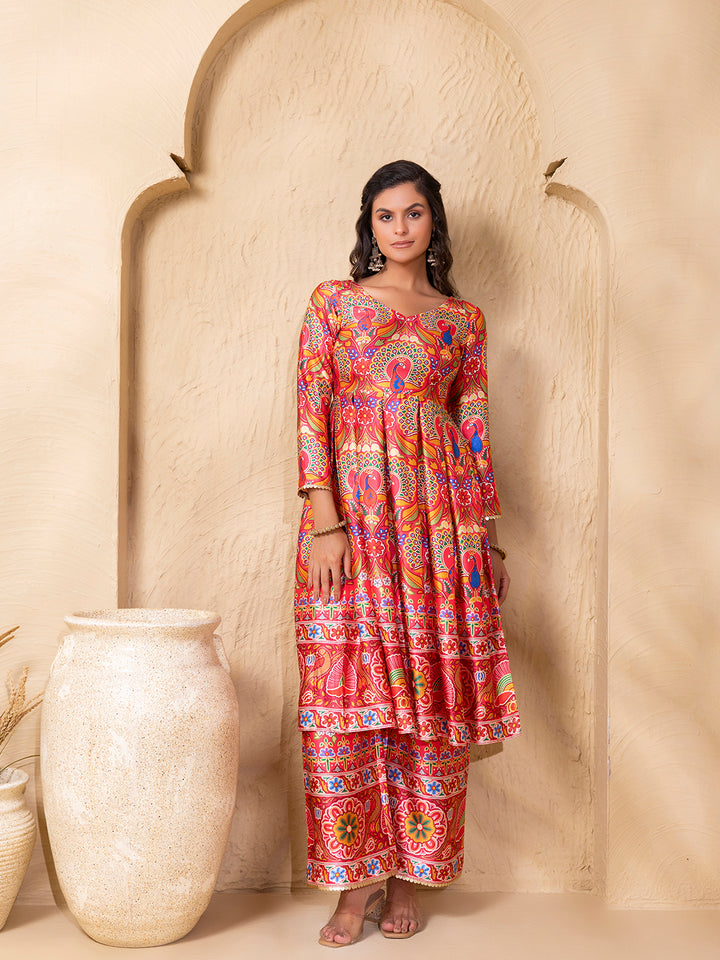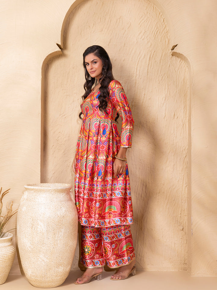 Box Pleat flare kurta with palazzo in Border Coral Gujrati Print