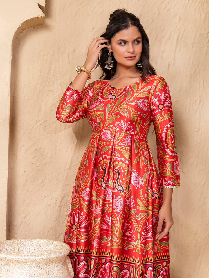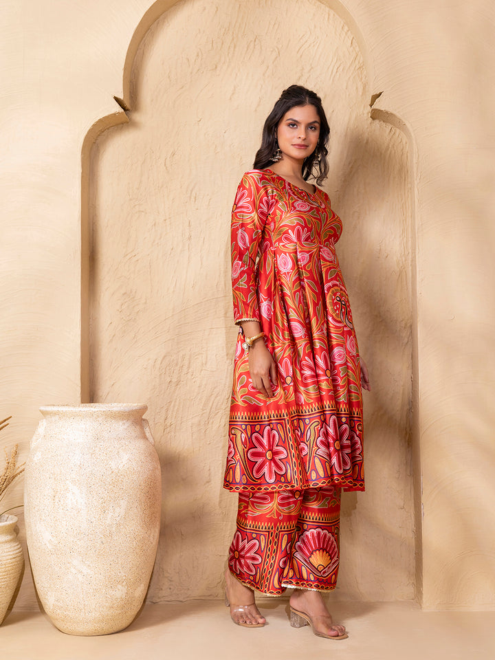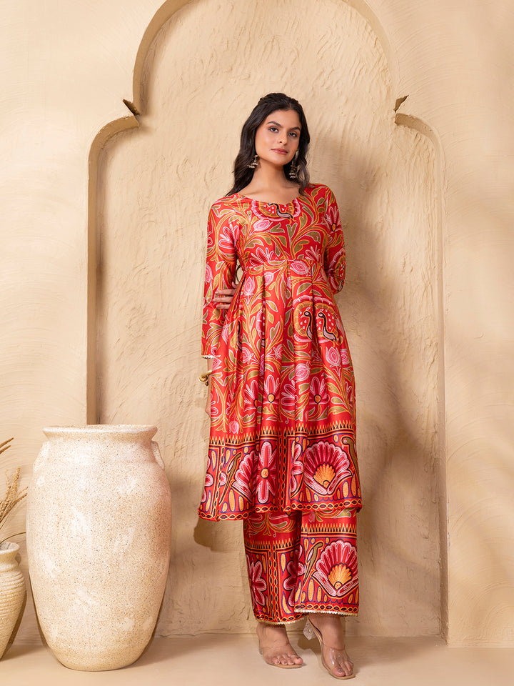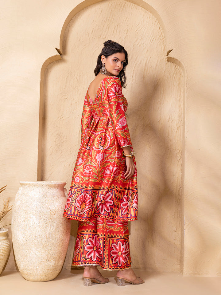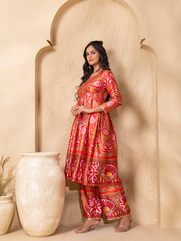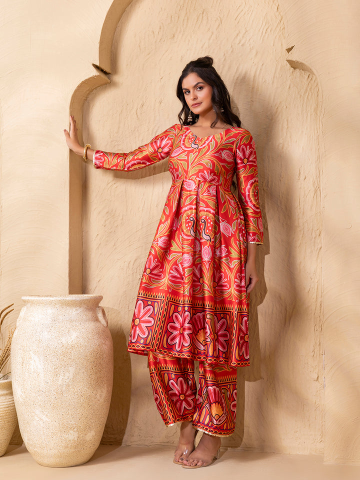 Box Pleat flare kurta with palazzo in Border Red Gujrati Print