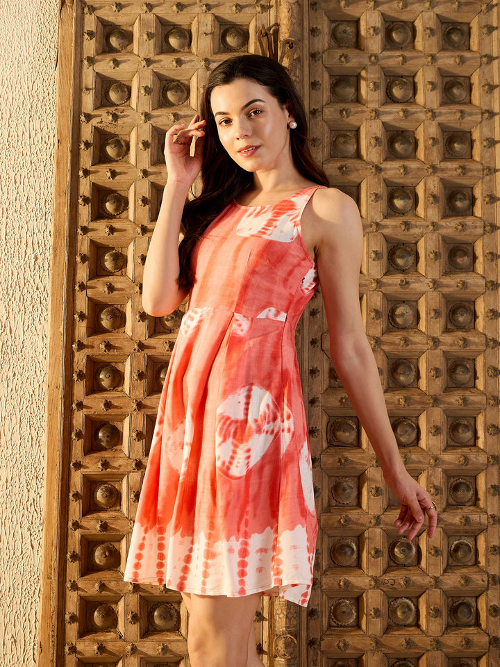 Center Box Pleat Mini Dress in Peach Tie & Dye