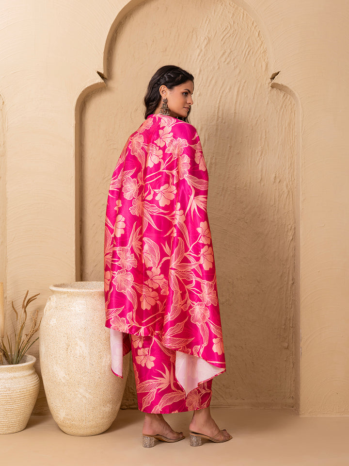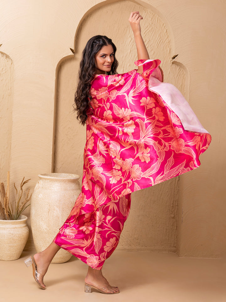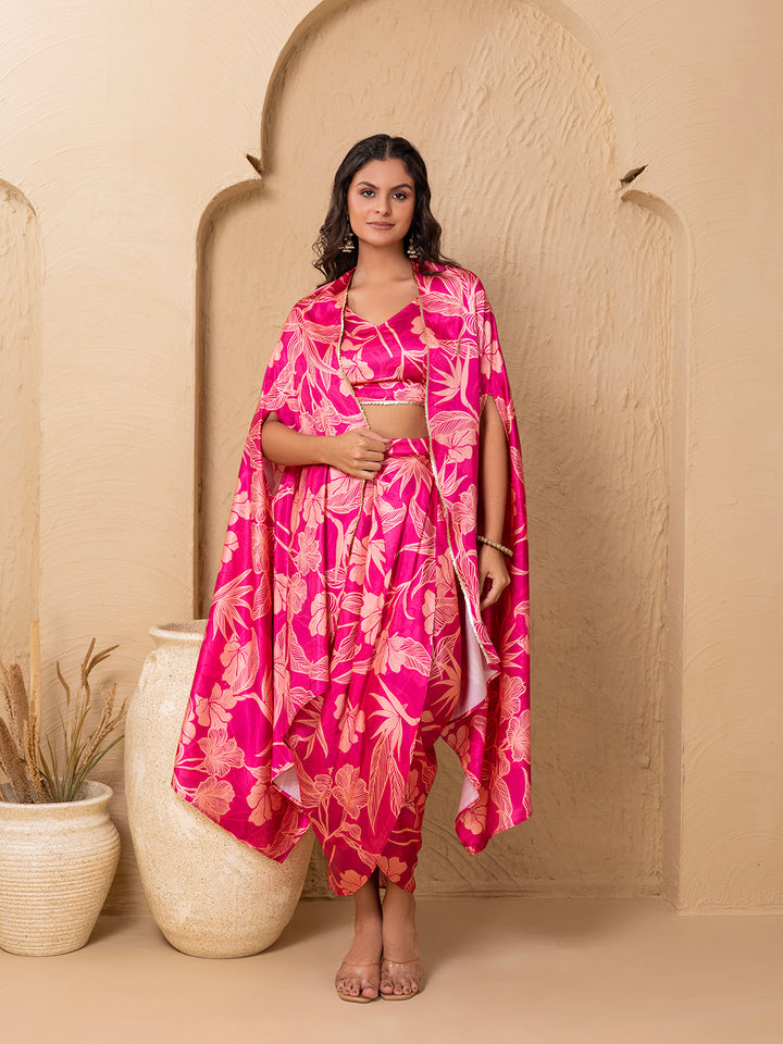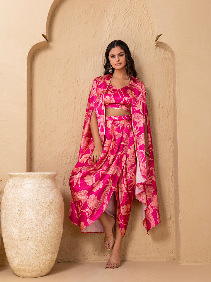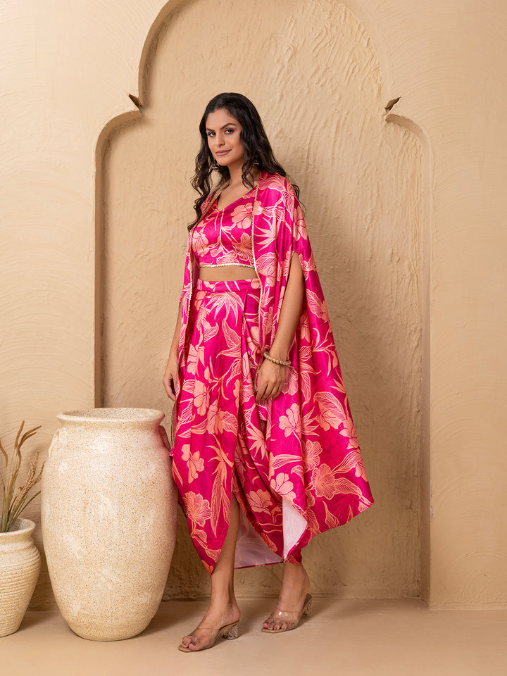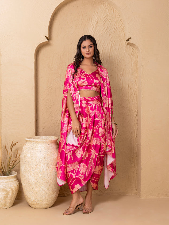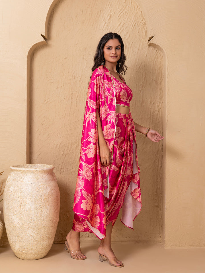 Crop Top with Draped Skirt And Cape in Pink floral Print