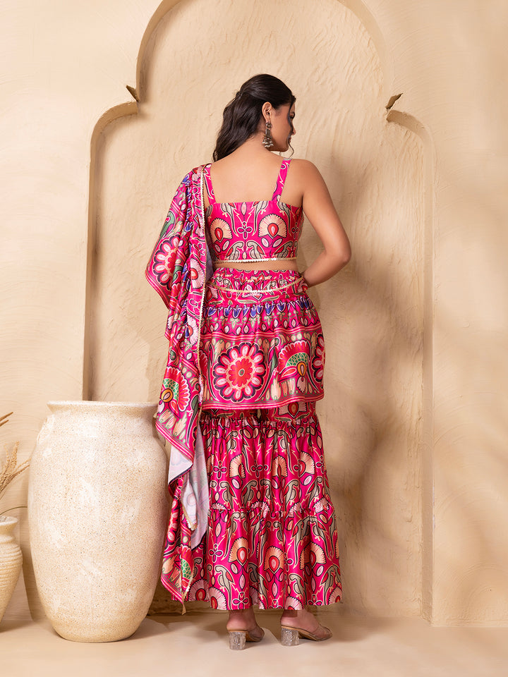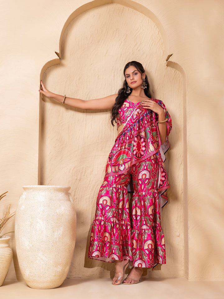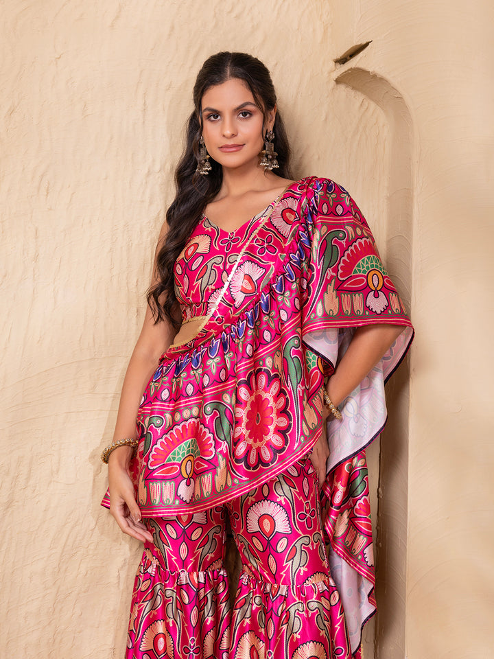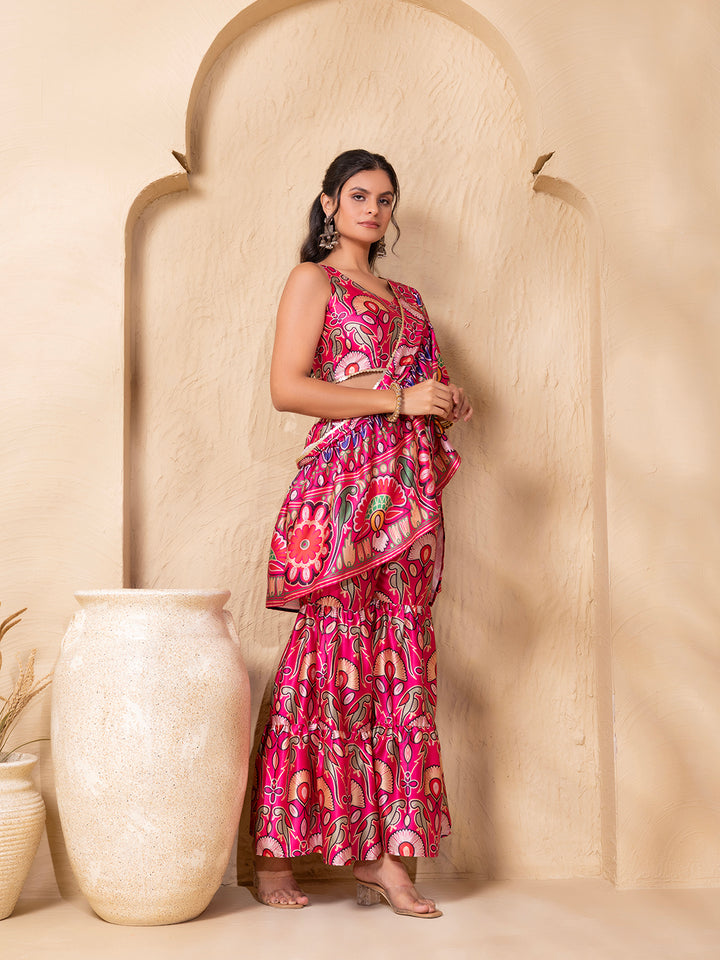 Crop Top with Sharara and frill Dupatta in Border Pink Gujrati Print