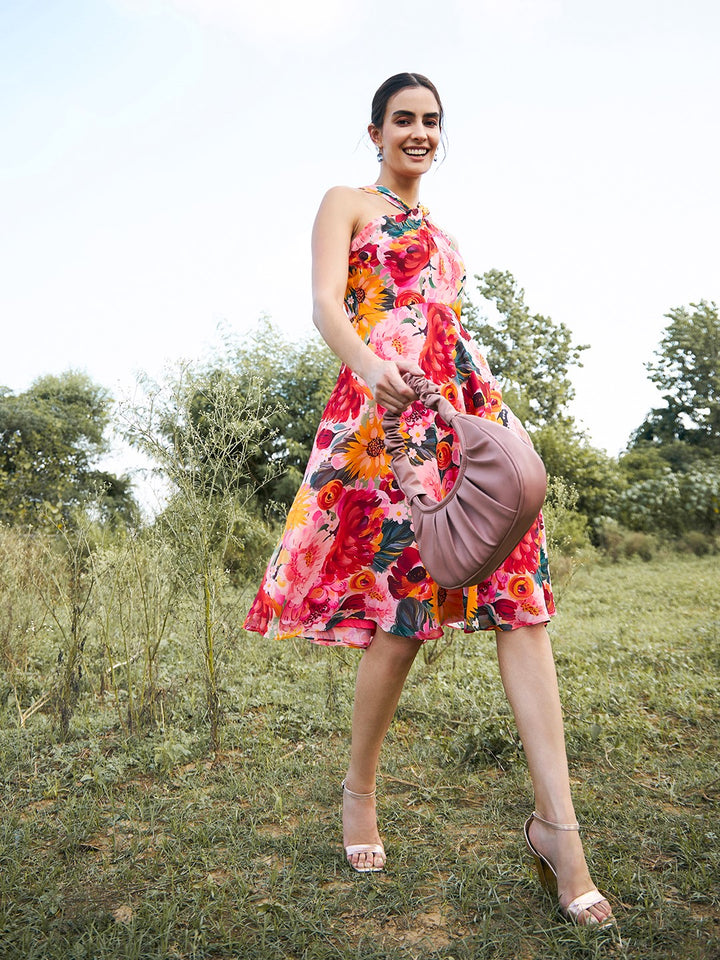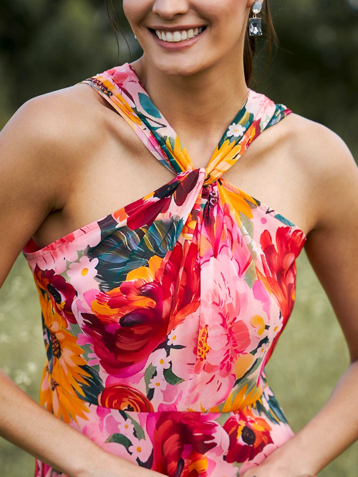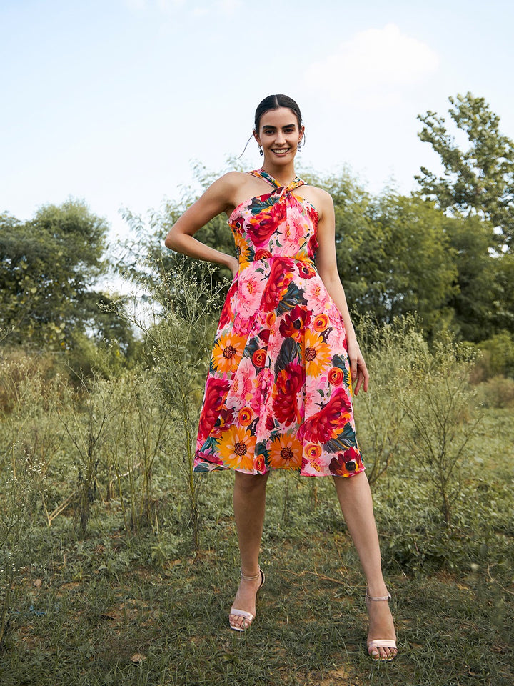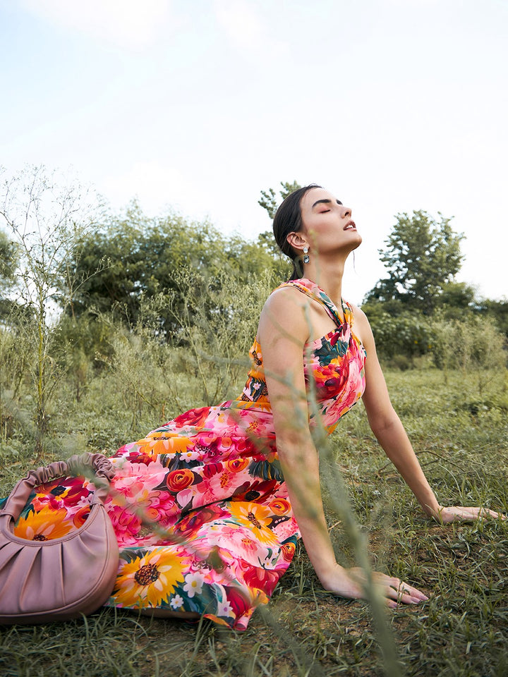 Draped neck midi dress in Multi Print