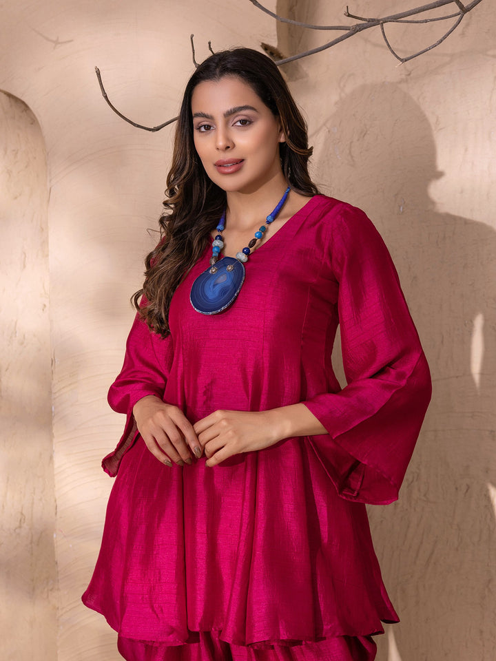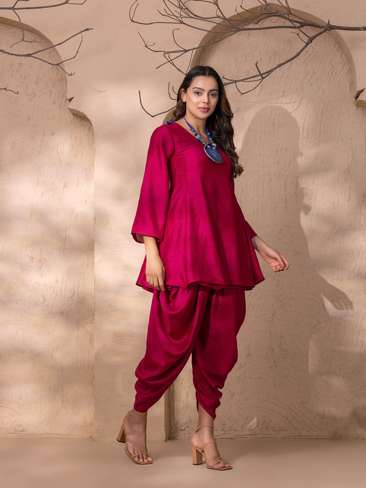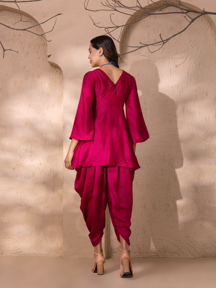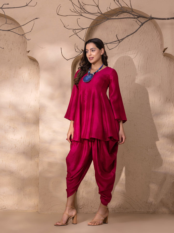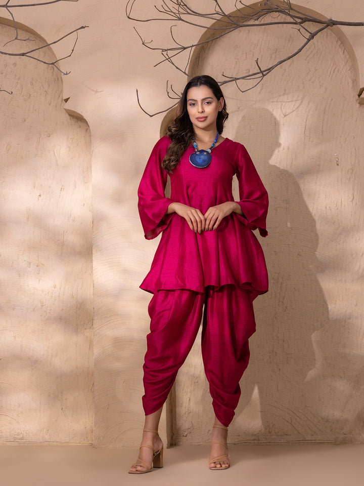 Flare bell sleeve kurta with dhoti in Fuchsia Silk