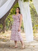 Frill Neck A-line midi dress with IKKAT print in Mauve