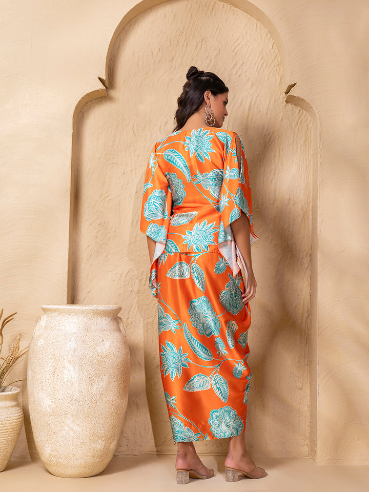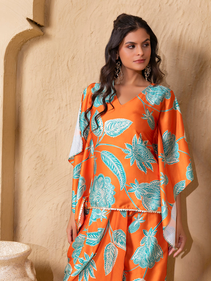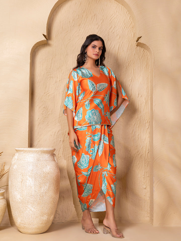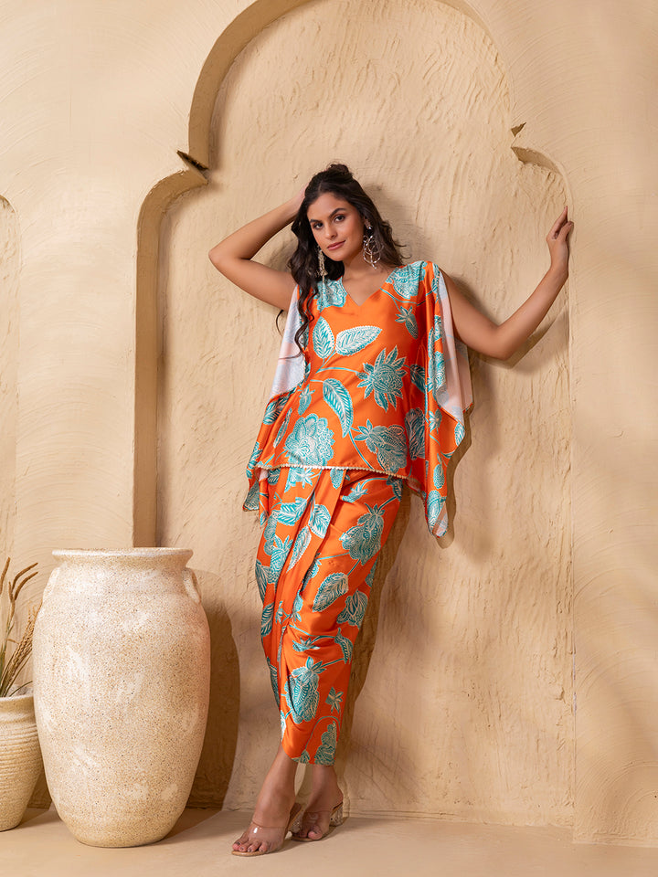 Kaftan Top with Dhoti Skirt in Orange Floral Print