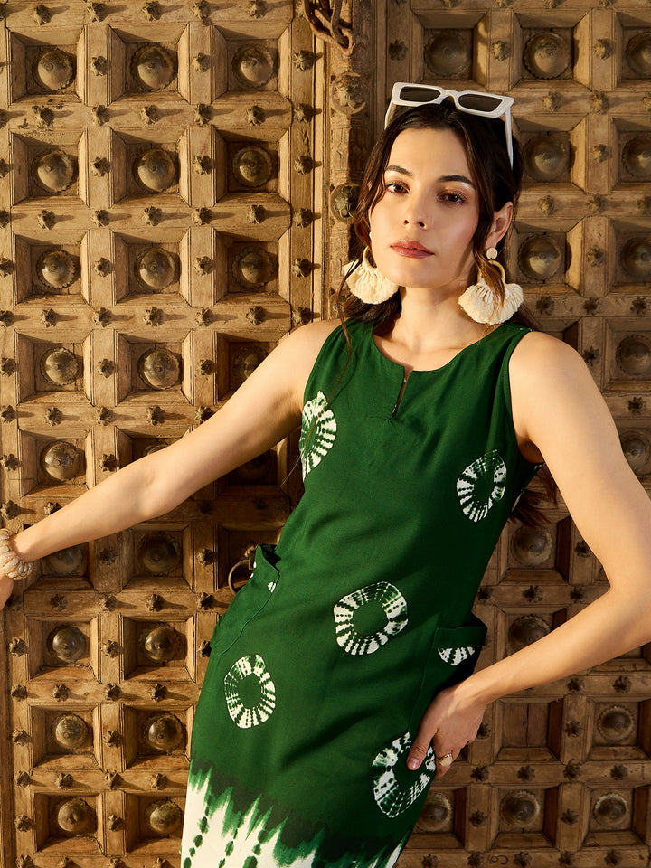 Kurta Neck Mini Dress with Side Pockets in Green Tie & Dye