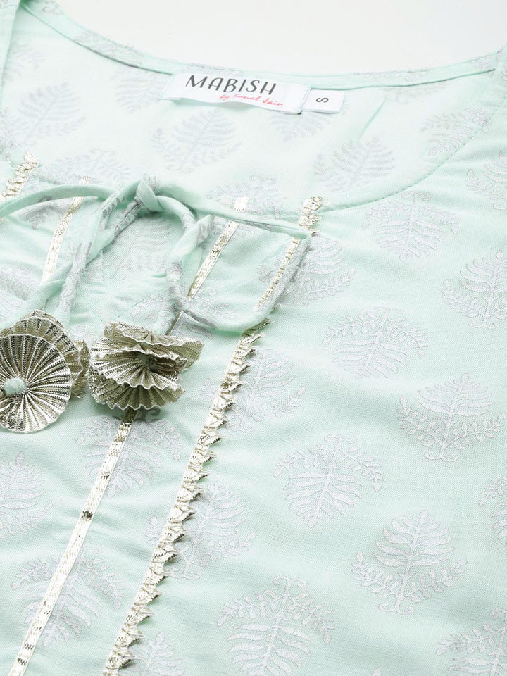 Step out in style with this set from Mabish. Don this look this season for a festive outing with family and friends. Add chunky jewellery like jhumkas and choker accessories.