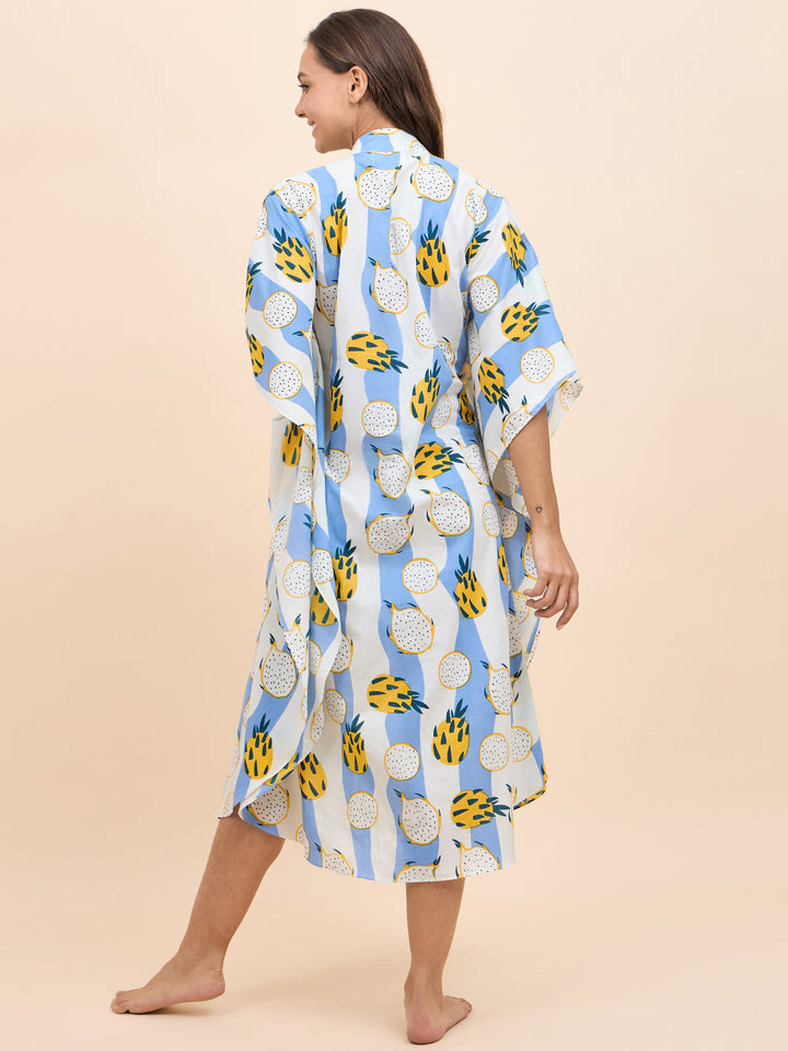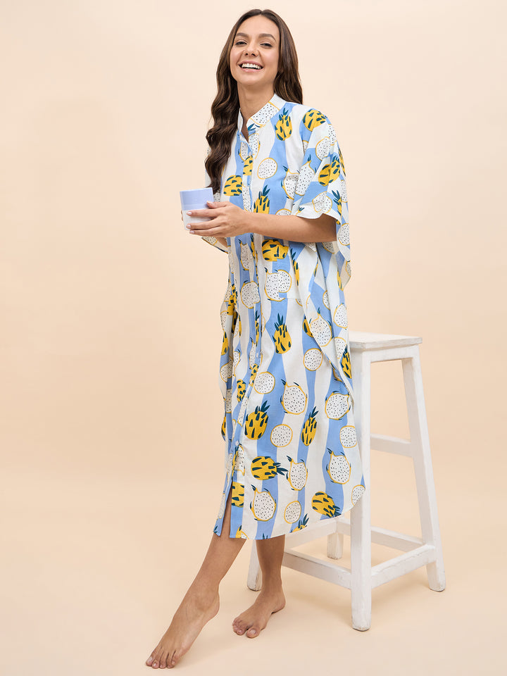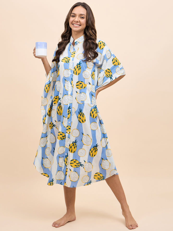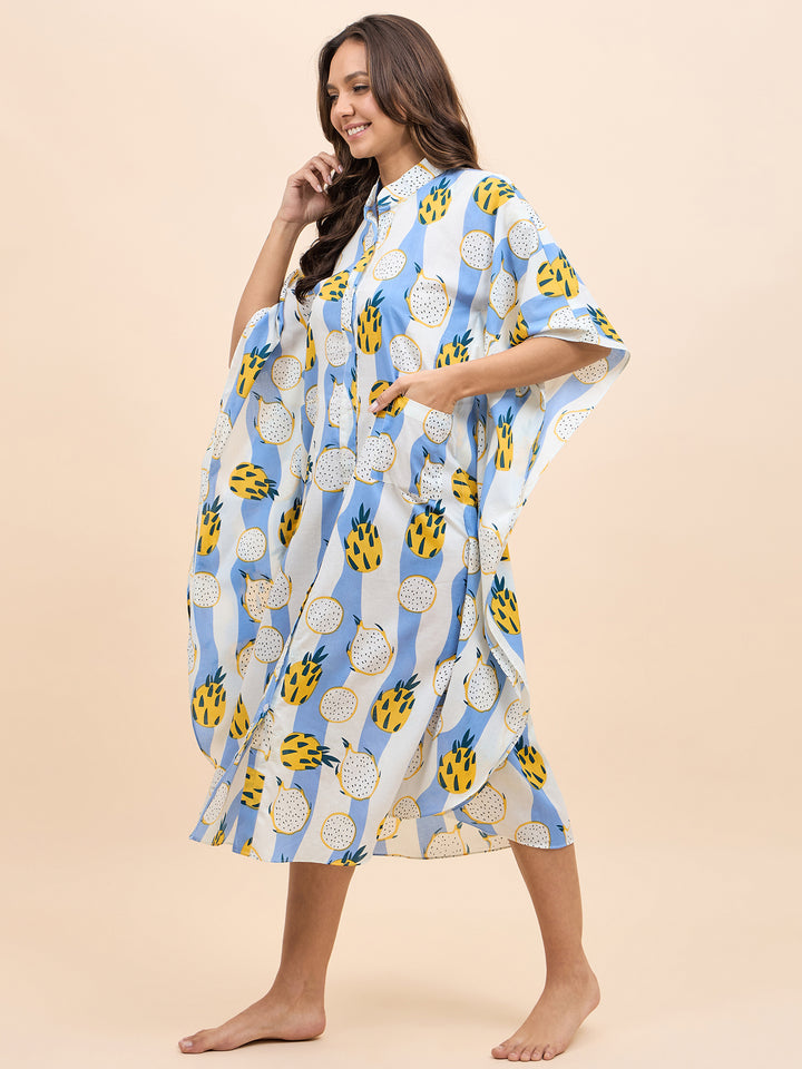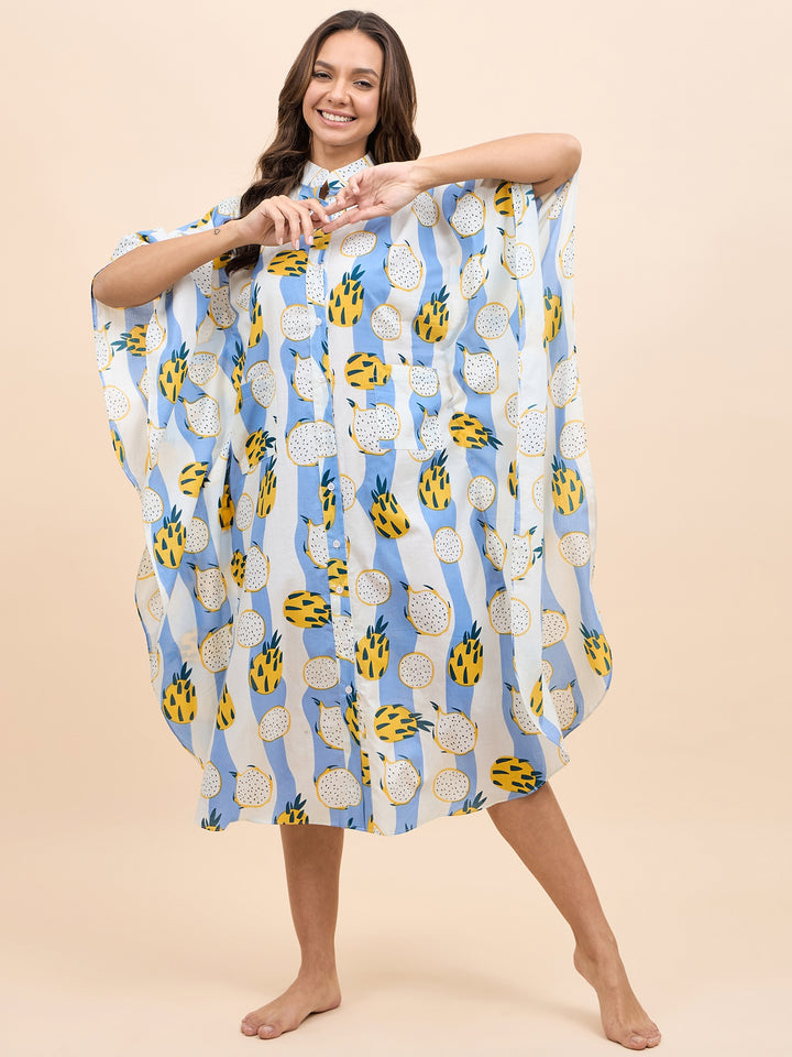 Long Kaftan Dress in Blue and Yellow DragonFruit Print
