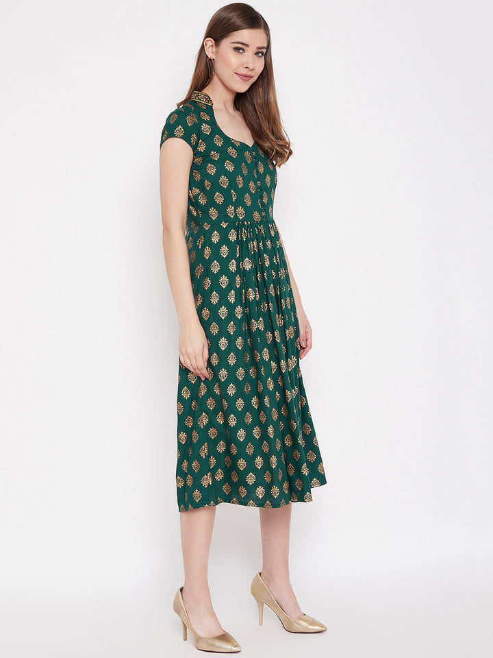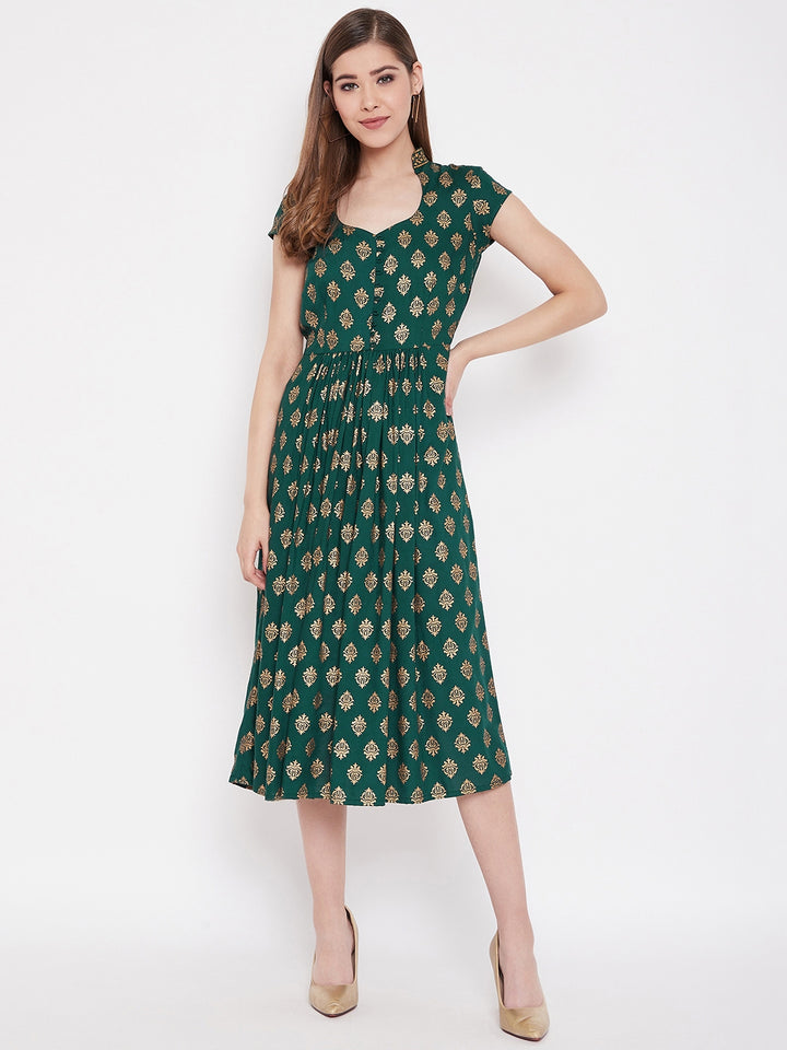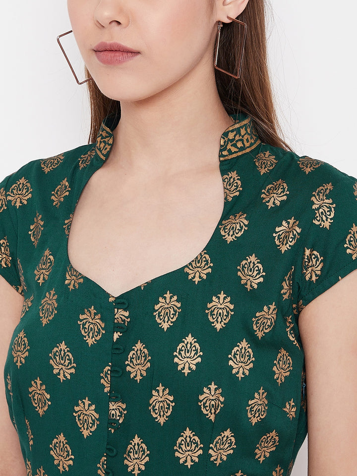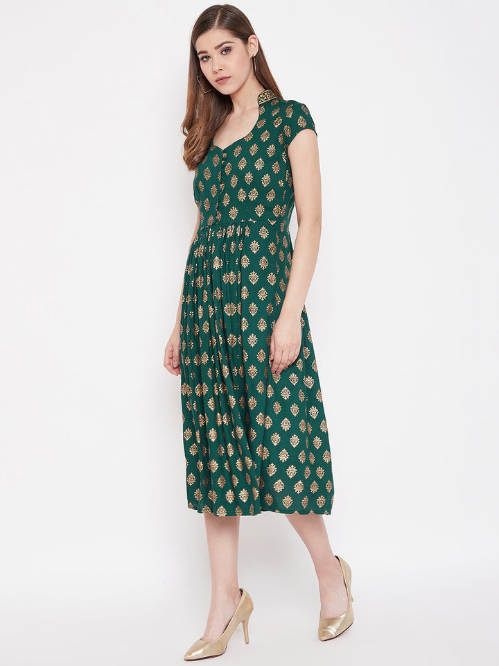 Amp-up your festive look with this metallic print Fusion dress. The set features gorgeous metallic print all-over, making it a festive must-buy. Style this with a pair of heels and gold danglers to complete the look.