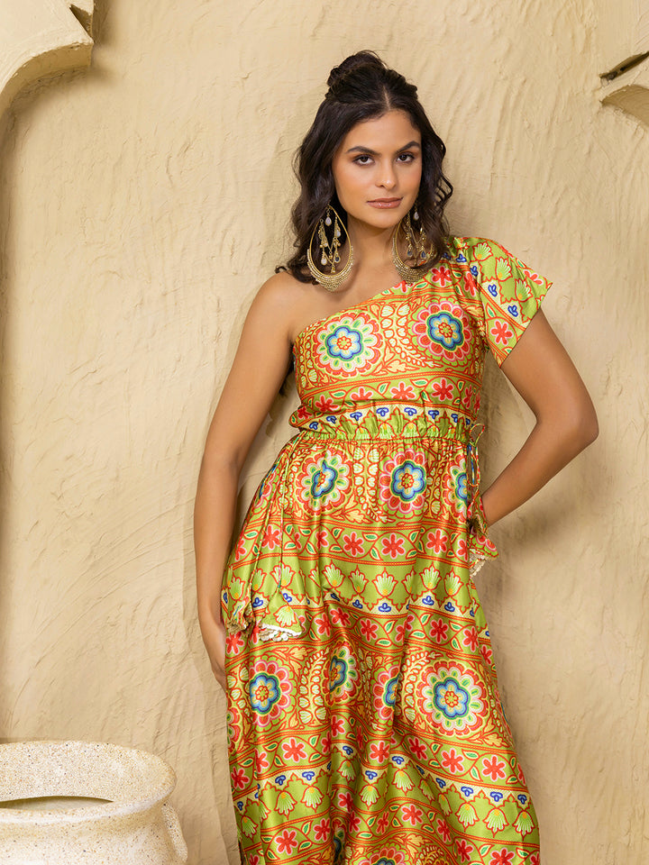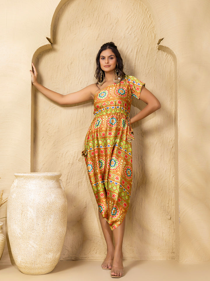One shoulder dhoti Jumpsuit in Border Green Gujrati Print