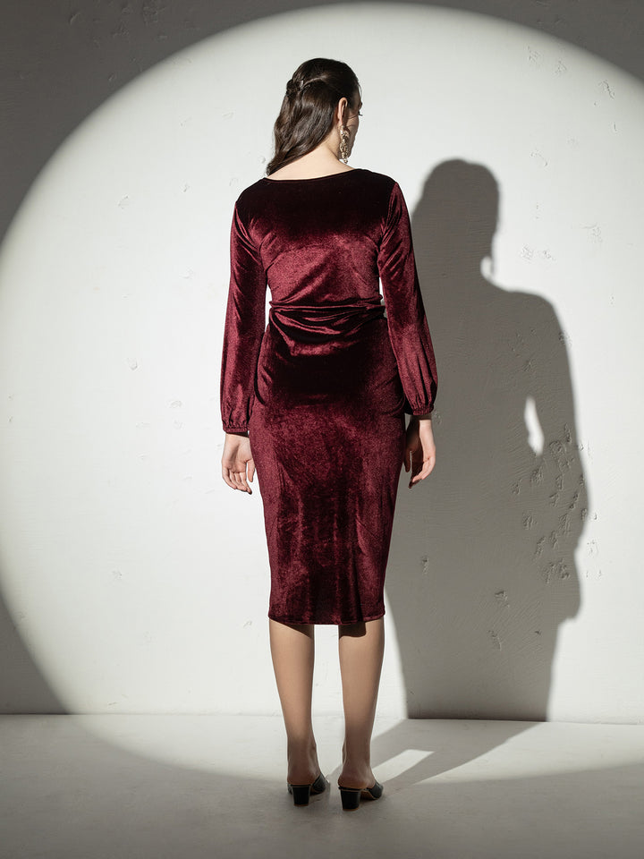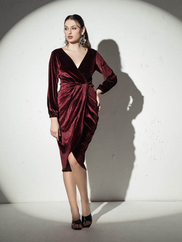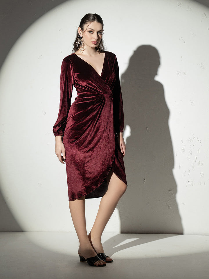 Overlap neck Tulip midi Dress in Wine