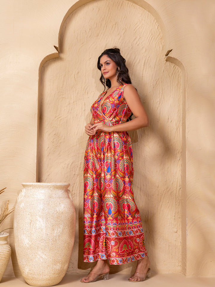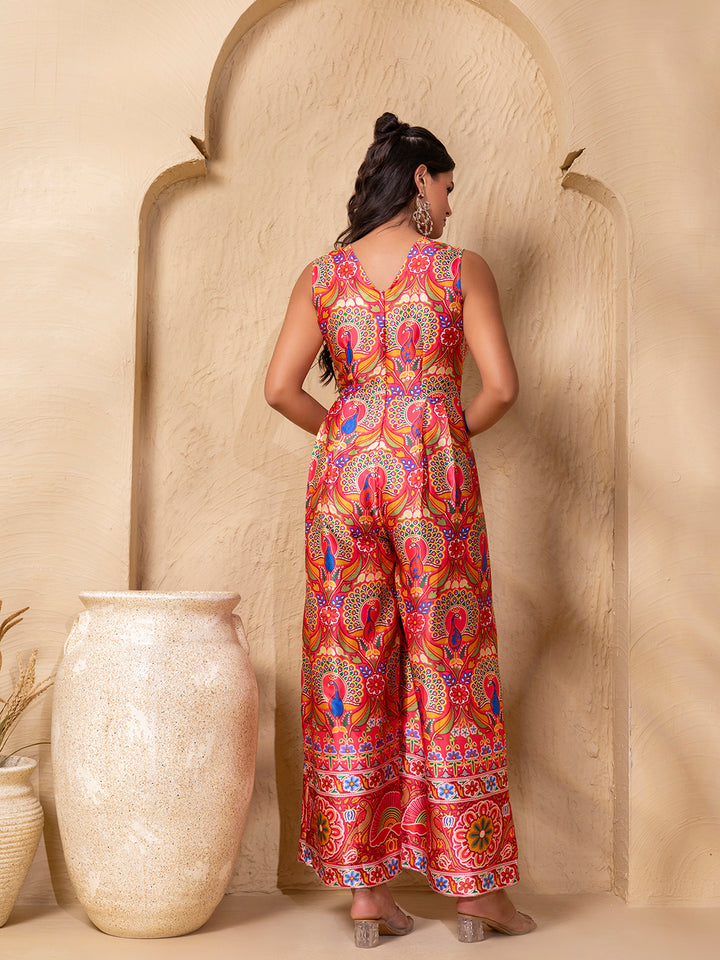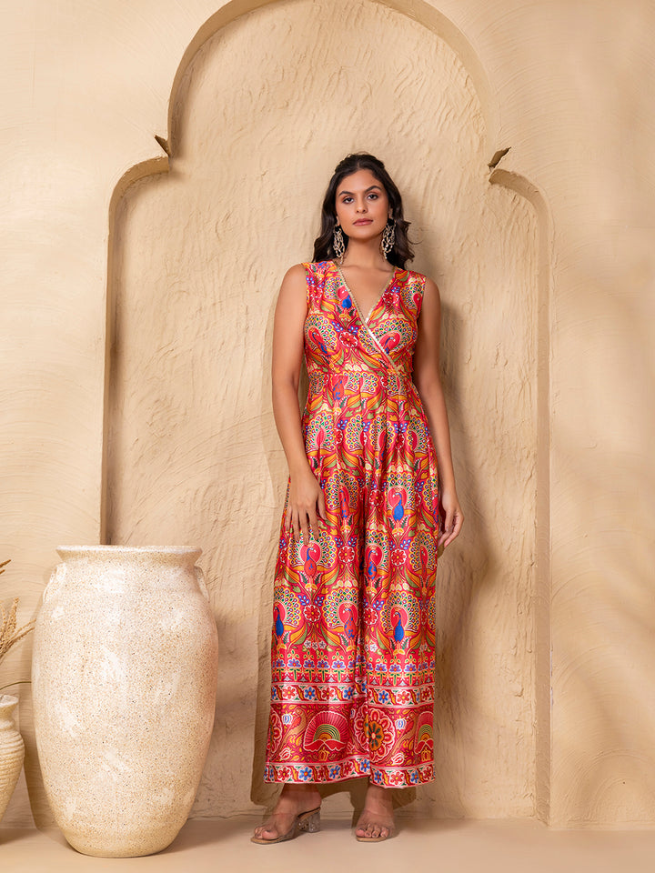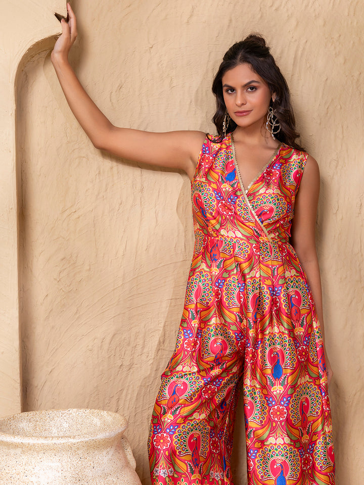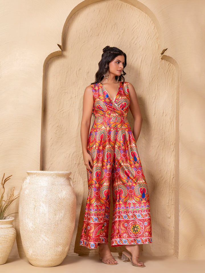 Overlap neck Wide Legged jumpsuit in Border Coral Gujrati Print