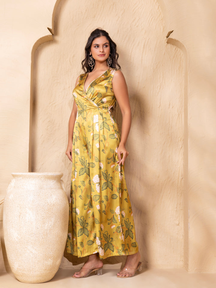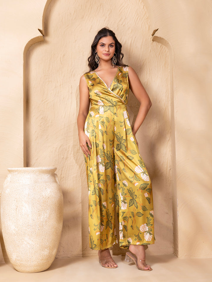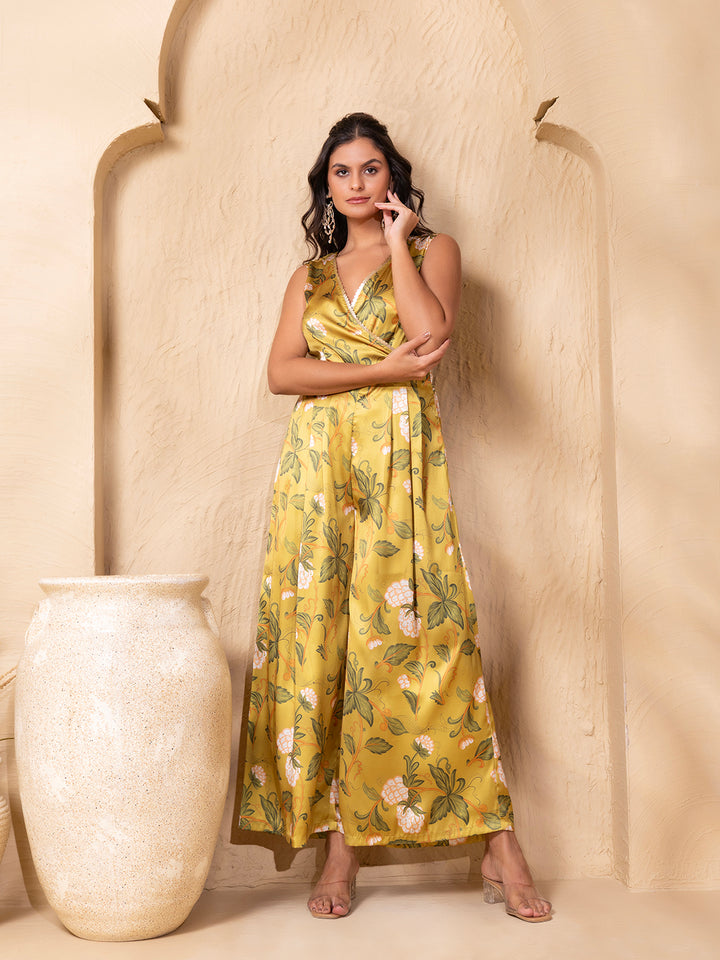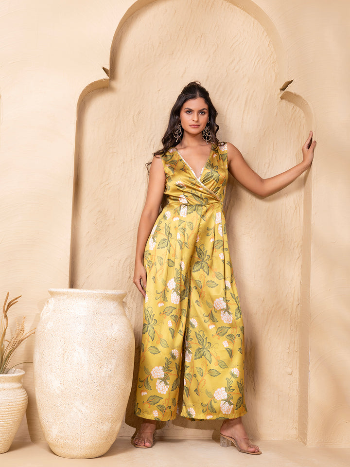 Overlap neck Wide Legged jumpsuit in Lime Green Grape Print