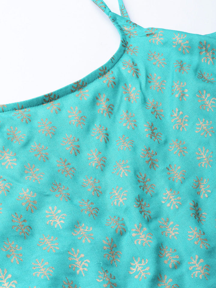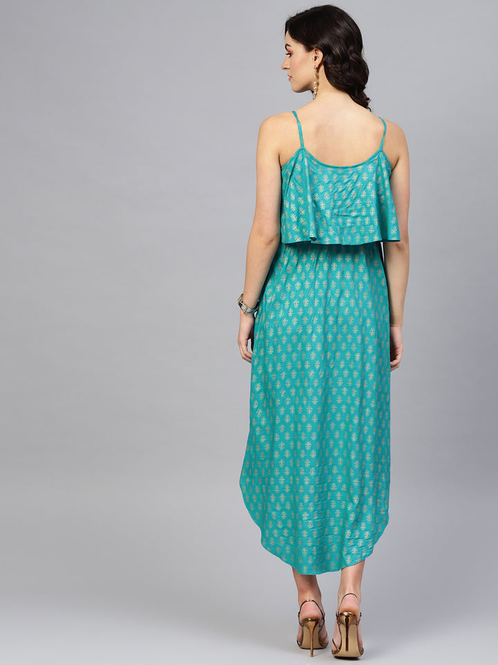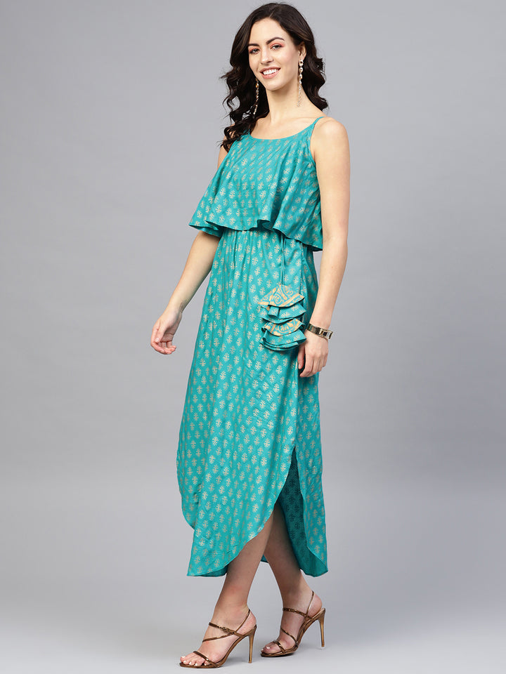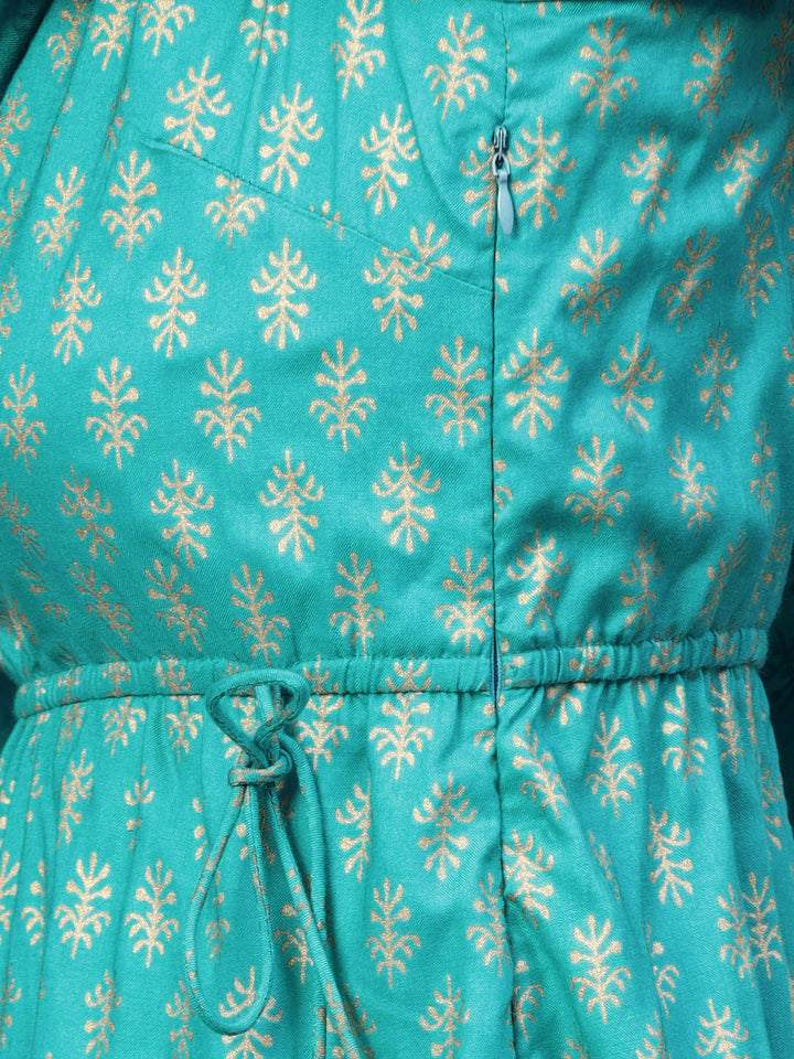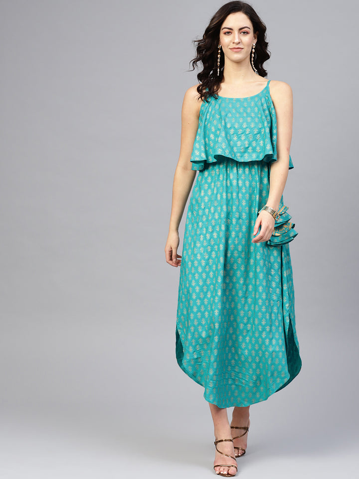 Amp-up your festive look with this metallic print Fusion dress. The set features gorgeous metallic print all-over, making it a festive must-buy. Style this with a pair of heels and gold danglers to complete the look.