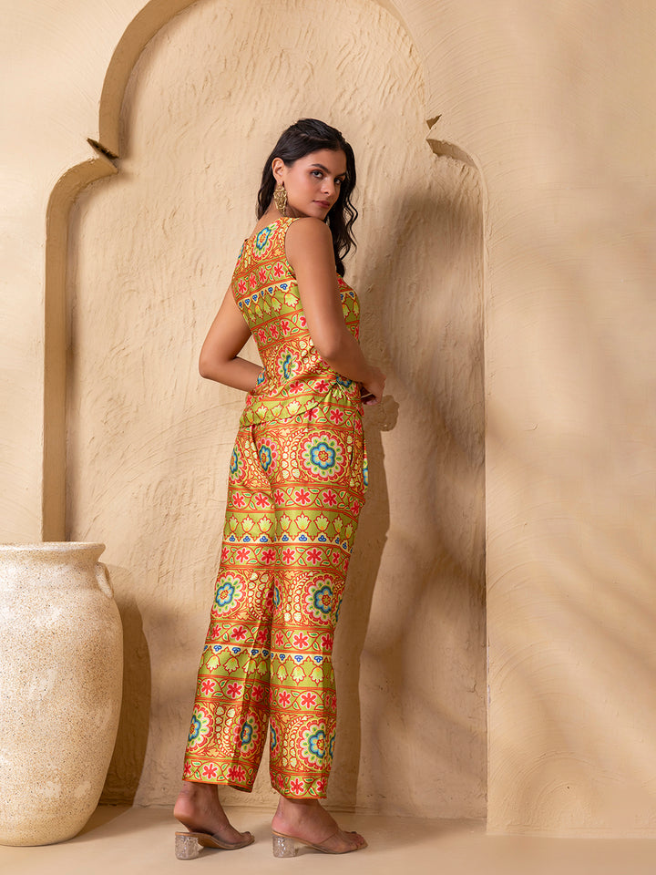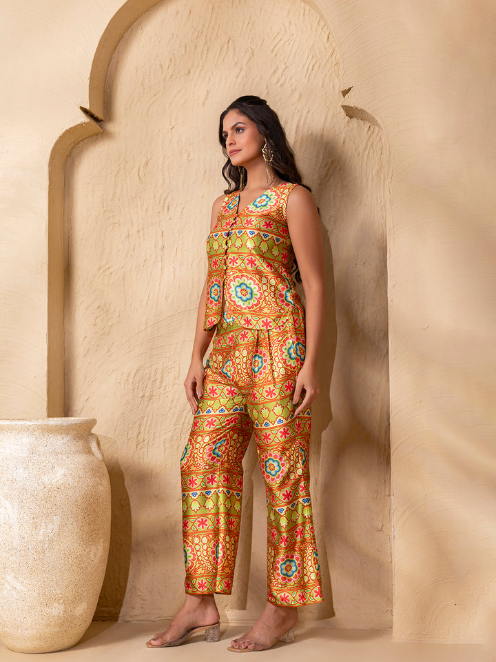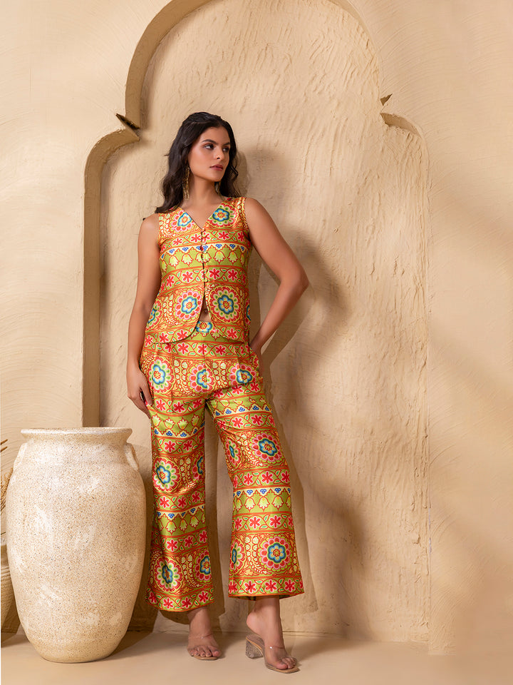 Rounded waist coat with loop buttons and Pants in Border Green Gujrati Print