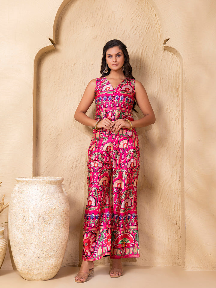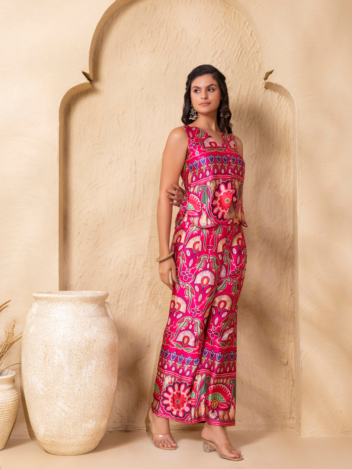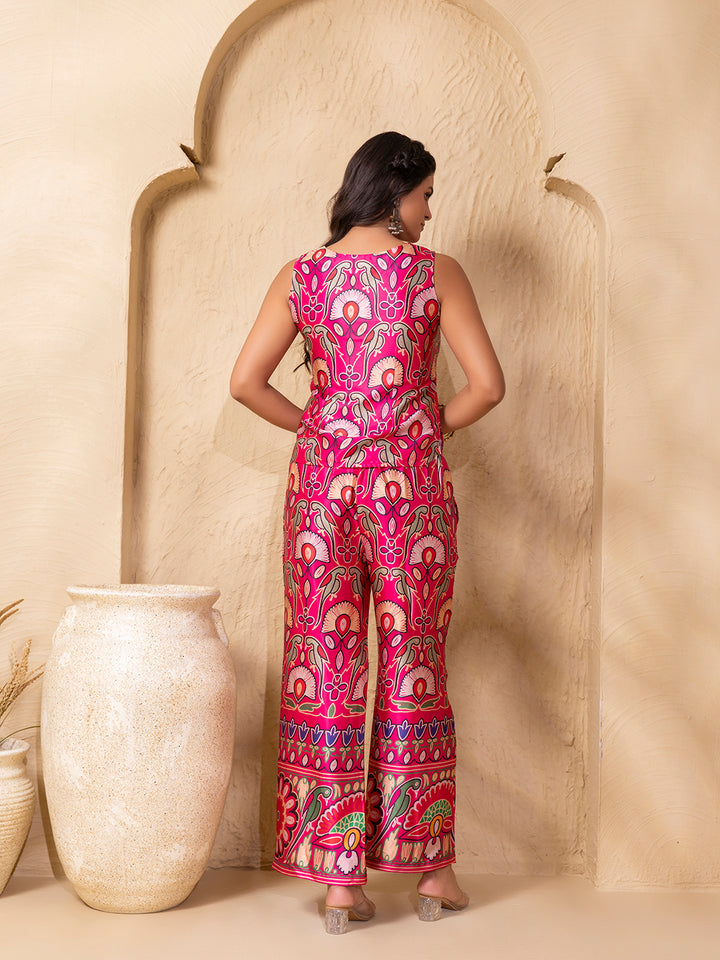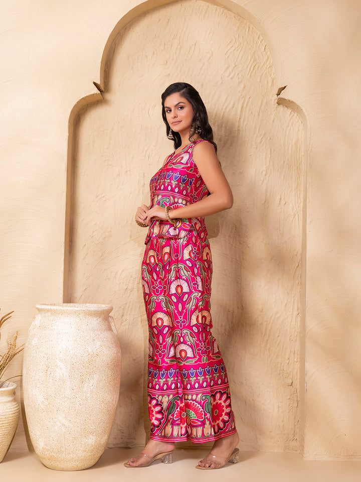 Rounded waist coat with loop buttons and Pants in Border Pink Gujrati Print