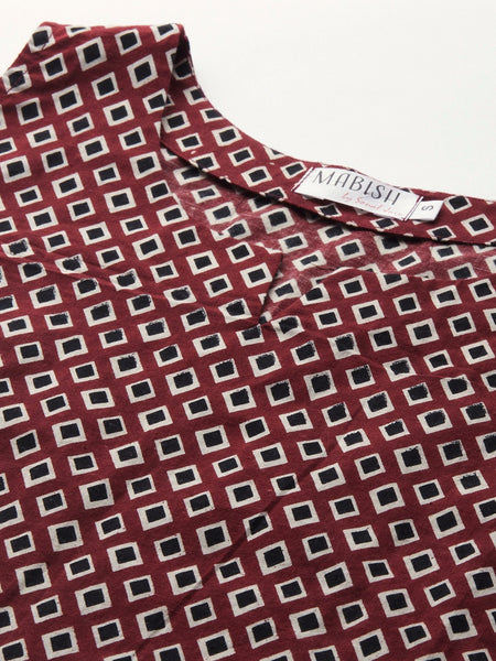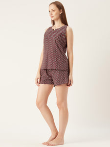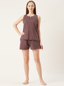 Sleeveless Kurta with shorts set in Maroon and Black Print