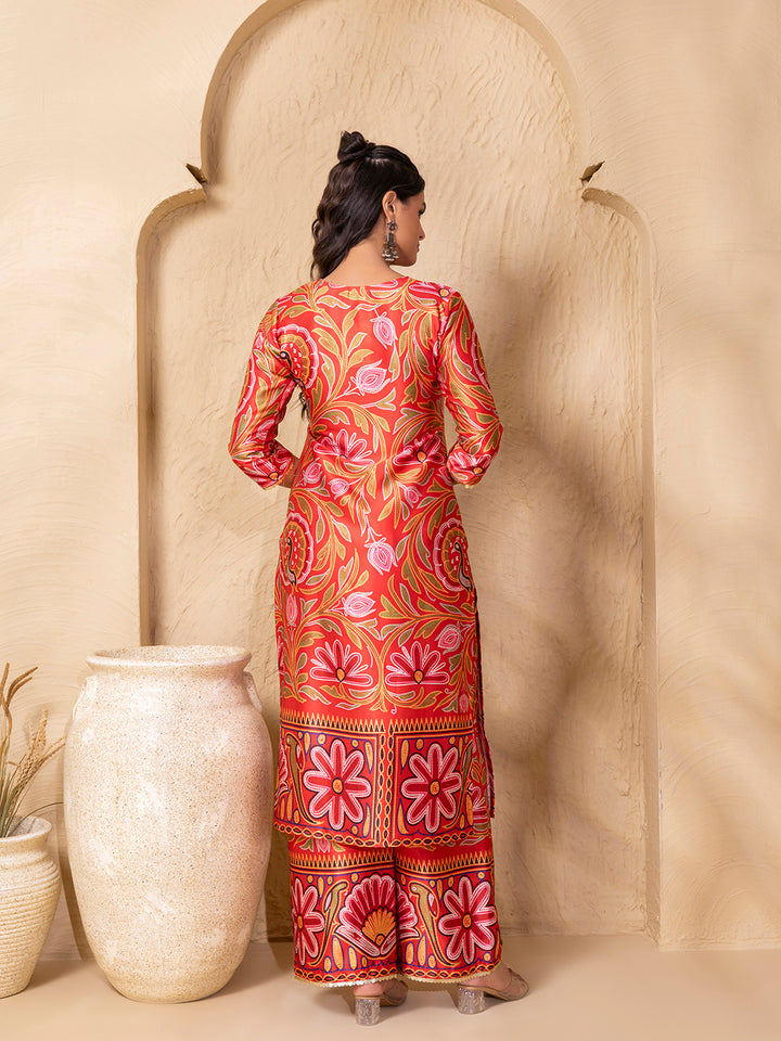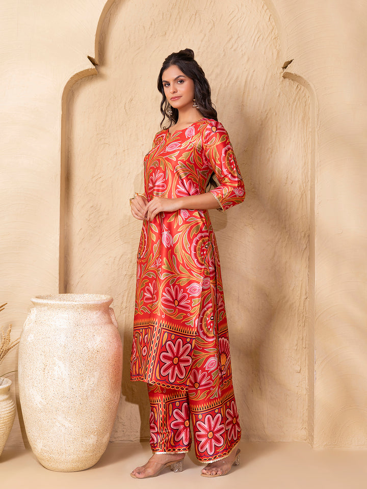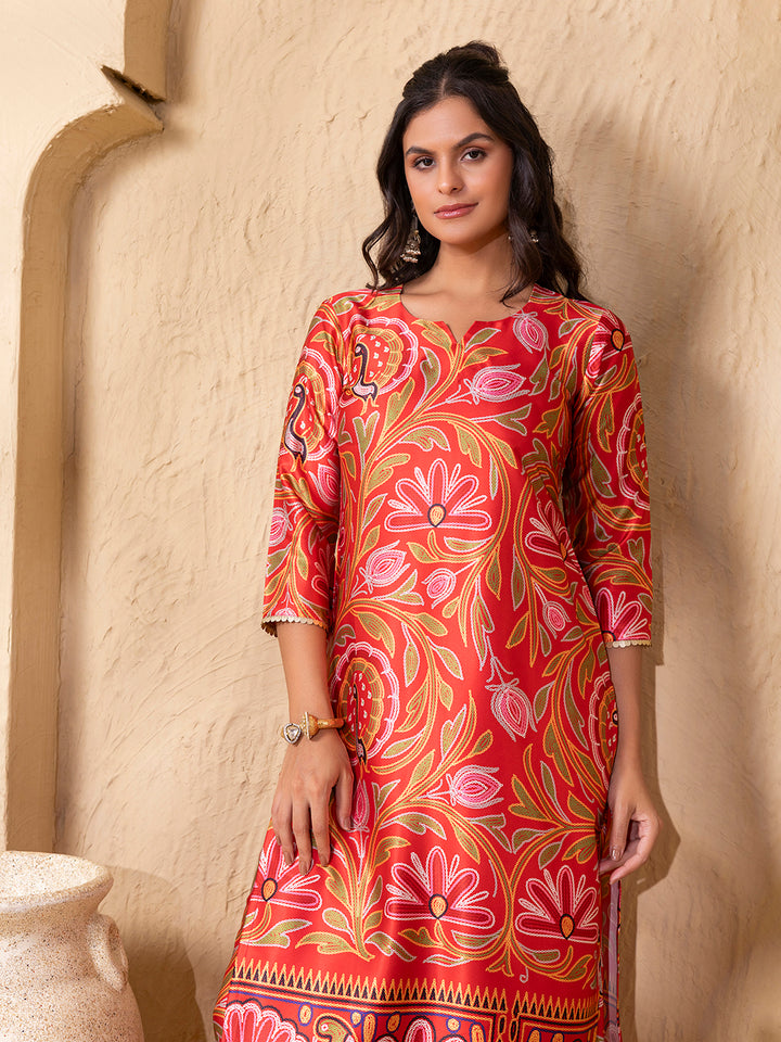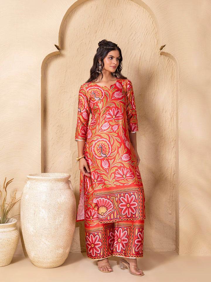 Staright Kurta with ankle palazzo in Border Red Gujrati Print