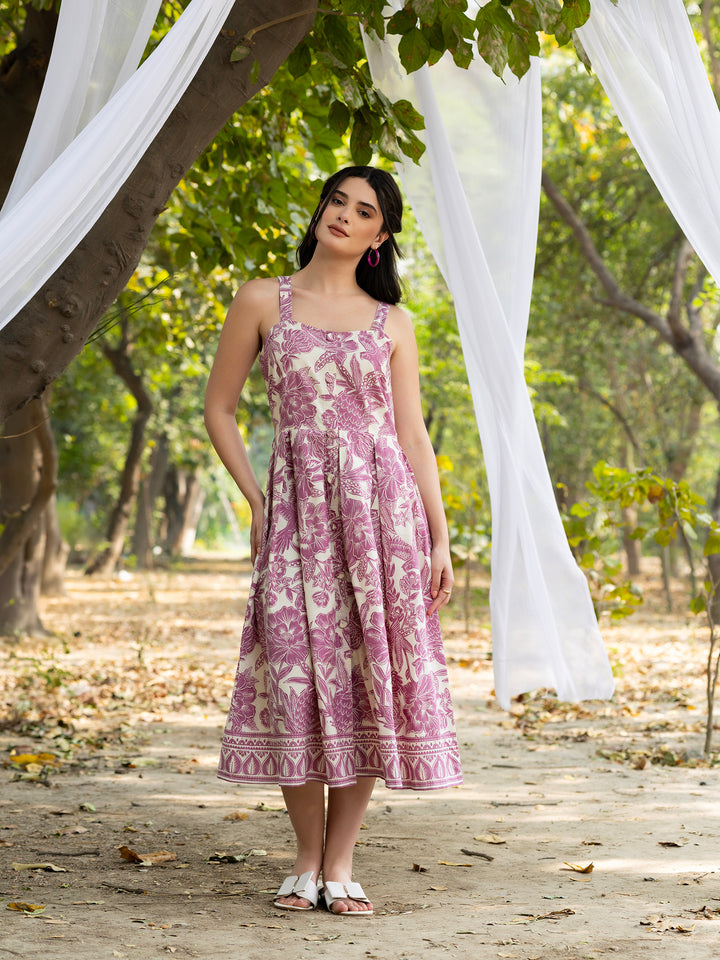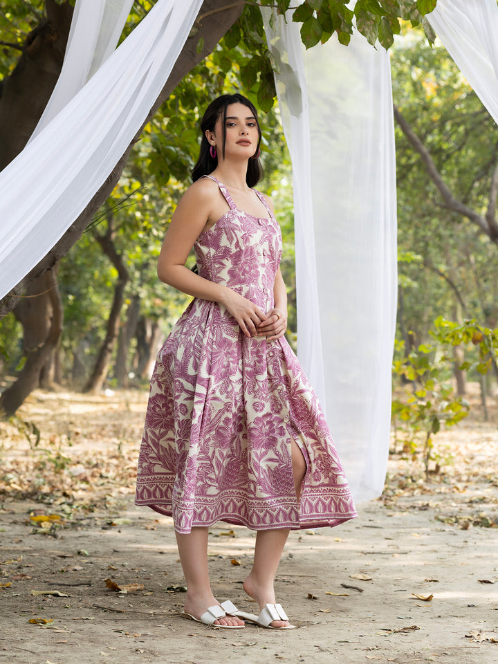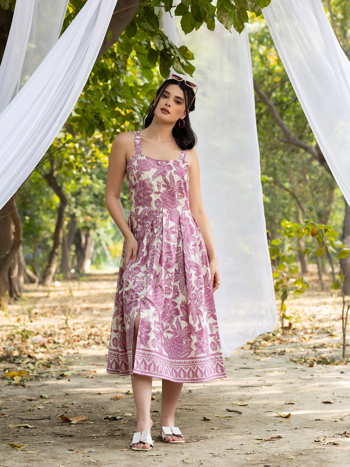 Strappy Box Pleat Midi Dress with all over bird print in mauve and white
