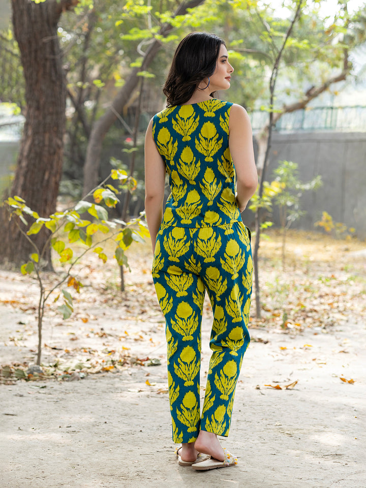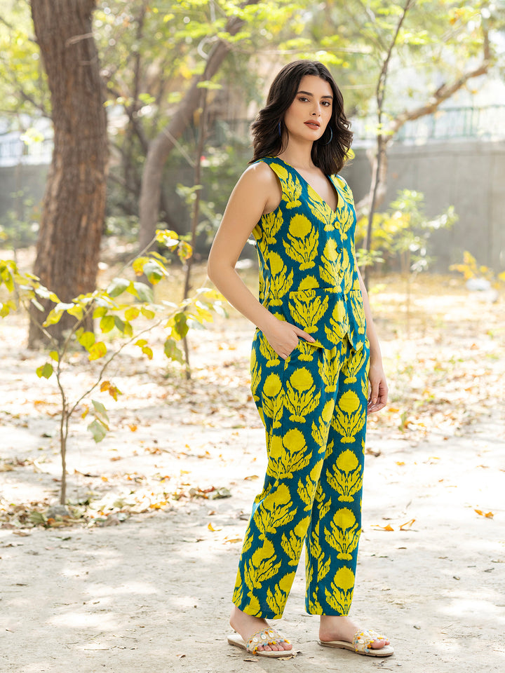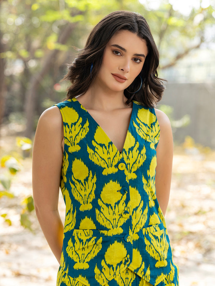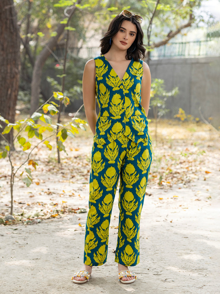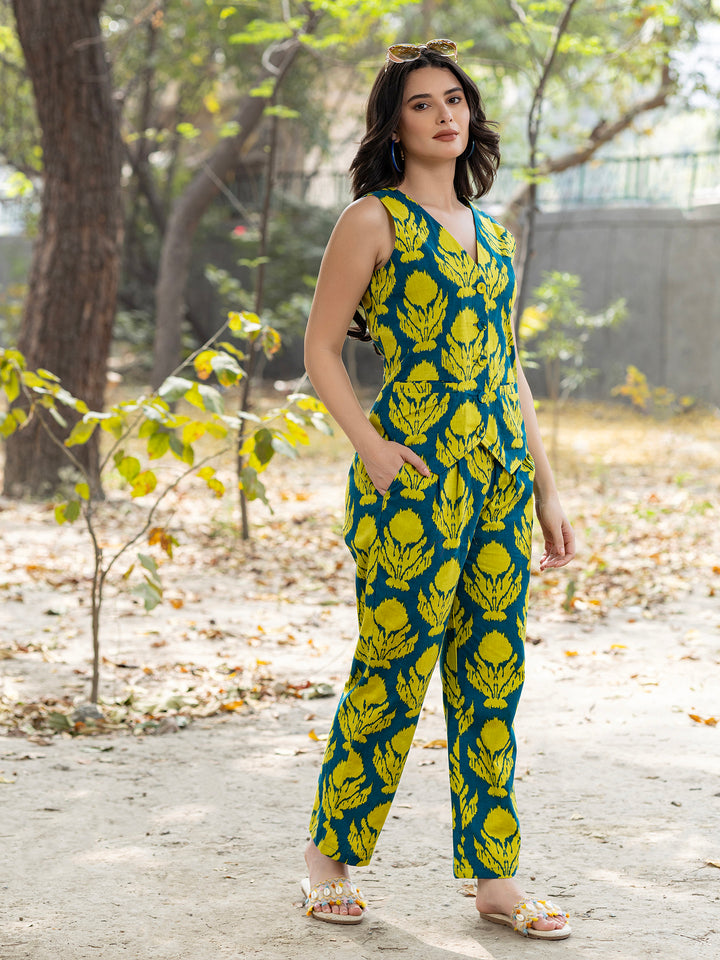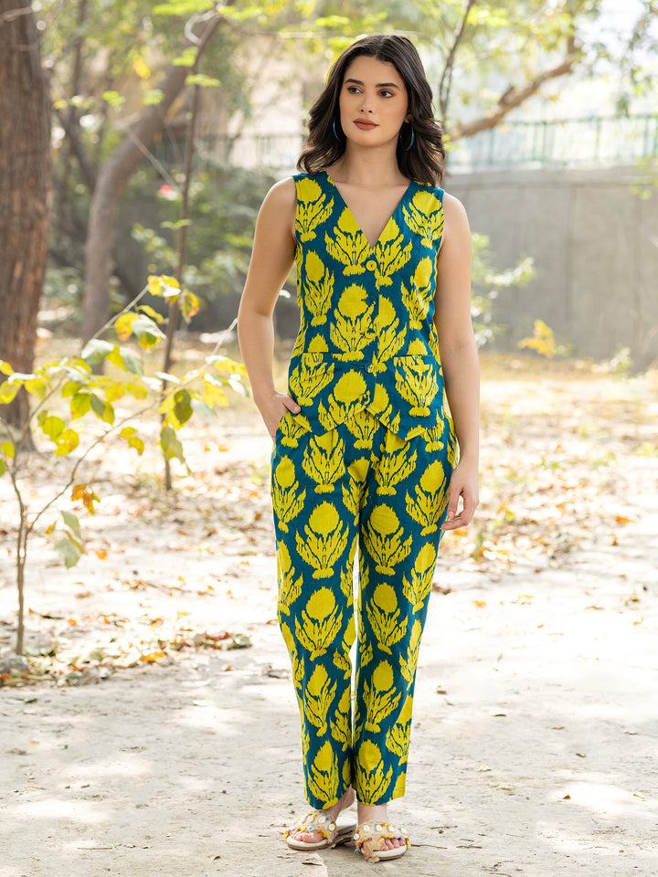 Waist Coat and Pants with IKKAT butti in teal blue and yellow